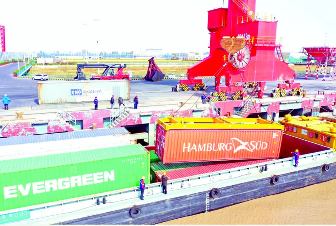 當天,“大港集003”號貨輪從阜寧港區出發,沿通榆河向北航行,抵達響水港區碼頭。“我們按照公司要求,周密部署作業方案,利用門機和集裝箱吊架將40多噸重的集裝箱穩穩地安放在貨輪上,高效完成集裝箱貨輪裝卸任務。”響水港務有限公司工作人員王玨介紹。