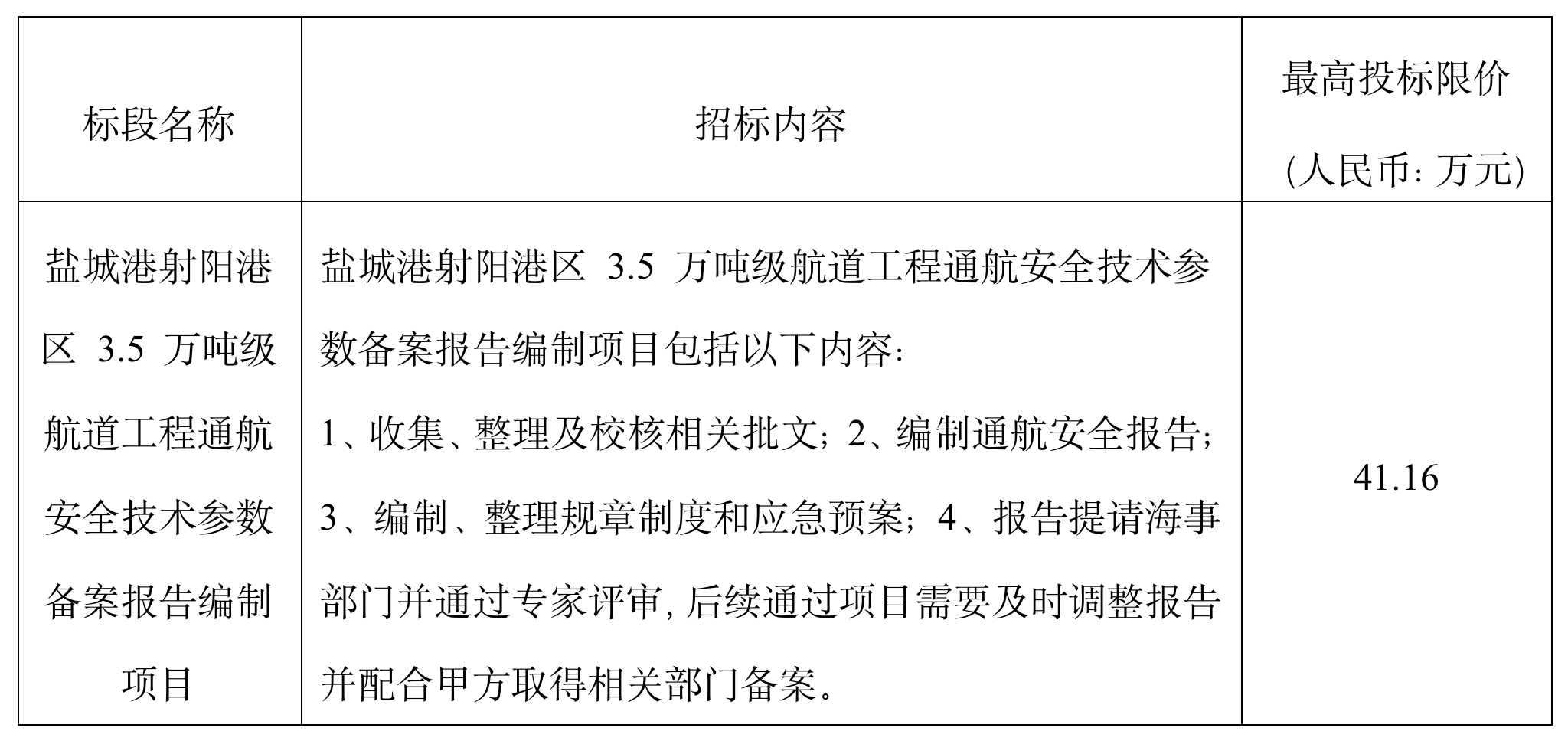 一、江蘇鹽城港射陽港開發集團有限公司負責實施的鹽城港射陽港區 3.5 萬噸級航道工程通航安全技術參數備案報告編制項目,已經相關部門批準建設。現決定對該項目進行公開招標,現邀請潛在投標人參加本項目投標。