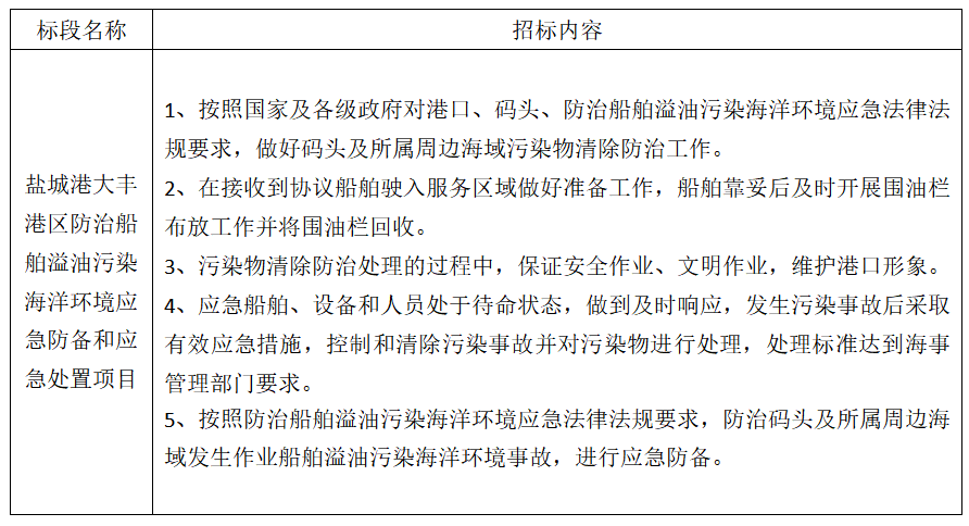 1、項目名稱:鹽城港大豐港區防治船舶溢油污染海洋環境應急防備和應急處置項目