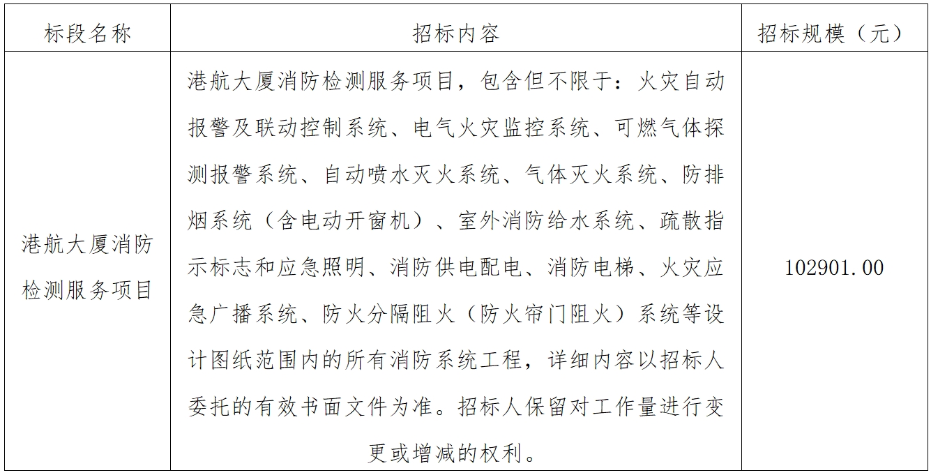 一、江蘇鹽城港控股集團有限公司負(fù)責(zé)實施的港航大廈消防檢測服務(wù)項目已具備招標(biāo)條件,項目所需資金已落實,現(xiàn)通過公開招標(biāo)方式邀請潛在投標(biāo)人參加本項目的投標(biāo)。