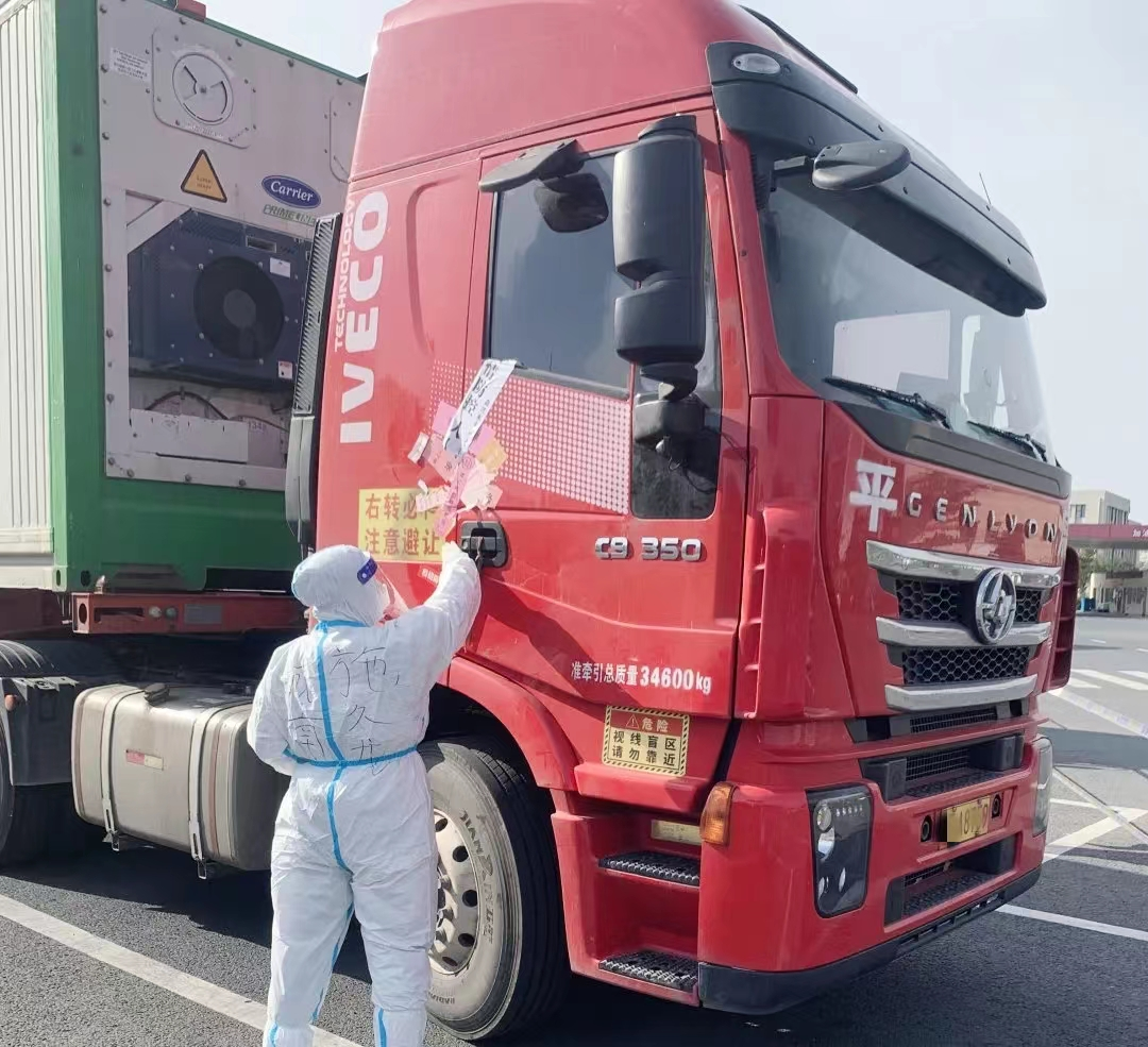貨車司機的管控一直都是農業(yè)科技集團的難點所在,對此農業(yè)集團對來轄區(qū)作業(yè)的貨車司機采取“二對一”的護送方案,即前后跟車,貨車駕駛員不下車,由我們的網格員穿著防護服承擔起裝卸任務,全程閉環(huán)完成,雖然辛苦,但是極大地保證了防疫的安全性。