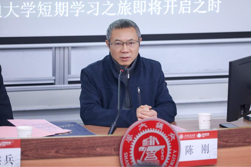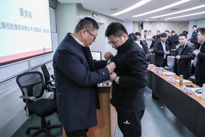 在開班儀式上,陳剛、梁洪兵親手為學員代表佩戴上海交通大學校徽,這標志著學員們正式加入上海交通大學大家庭,開啟全新的學習旅程。
