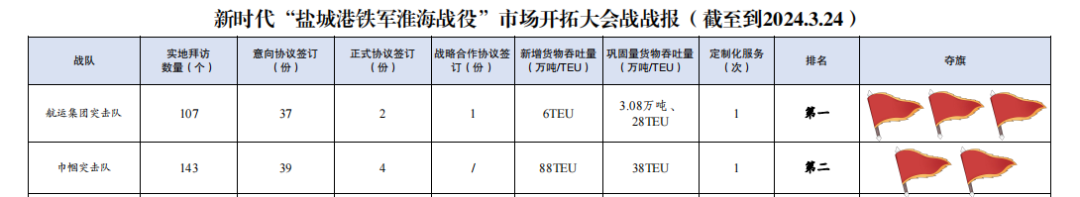 自新時代“鹽城港鐵軍淮海戰役”市場開拓大會戰開展以來,航運集團積極響應鹽城港集團黨委號召,成立航運集團突擊隊和巾幗突擊隊,持續深化攬貨拓源,大力弘揚“鐵軍精神”,成功實現市場開拓“新突破”,將定制化、兜底式服務推向了“新高度”。截至目前,累計拜訪客戶308家,簽訂意向協議97份,簽訂正式協議8份,實現新增營收超100萬元,集裝箱走量1008TEU。根據新時代“鹽城港鐵軍淮海戰役”指揮部第二期戰報,航運集團包攬集體前兩名,個人前三名,全力打響“鹽城港鐵軍淮海戰役”市場開拓大會戰第一槍。