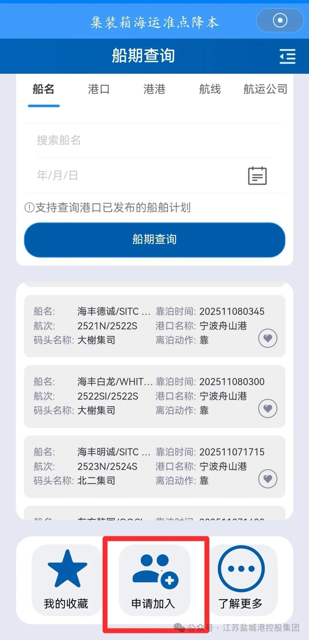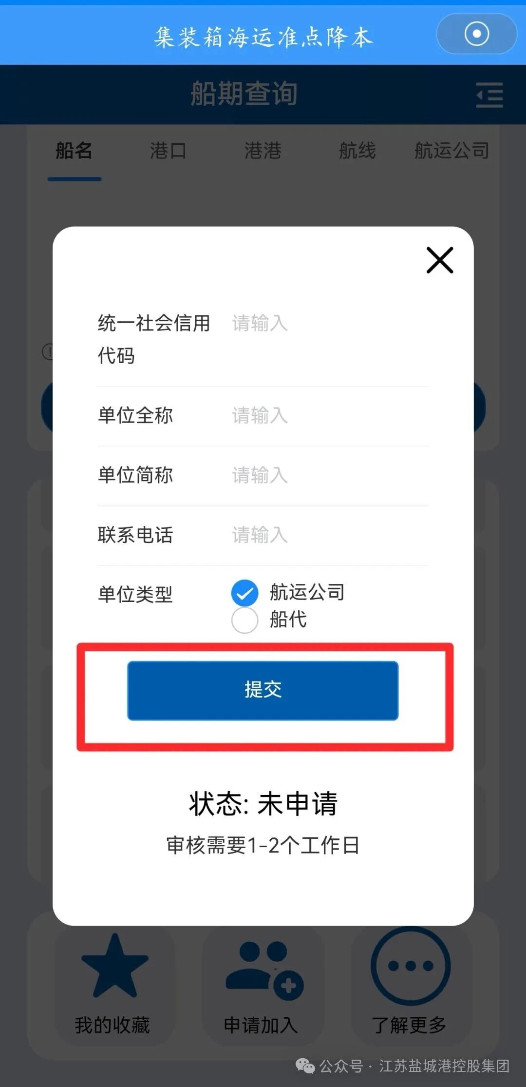 第三步:航運公司第一次登錄該模塊的用戶,系統(tǒng)默認顯示為船期查詢頁面,用戶點擊“申請加入”按鈕,選擇“我要加入”之后,輸入統(tǒng)一社會信用代碼、單位名稱、聯(lián)系電話、公司類型等相關信息,提交信息后,1-2個工作日之內,即可獲得完整的“準點降本”模塊使用權限。