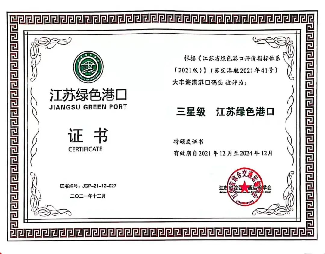 12月18日,2021年度江蘇省星級綠色港口授牌儀式在南京舉行,由鹽城港大豐港區(qū)港口公司申報的大豐海港港口碼頭獲得“三星級綠色港口”殊榮。