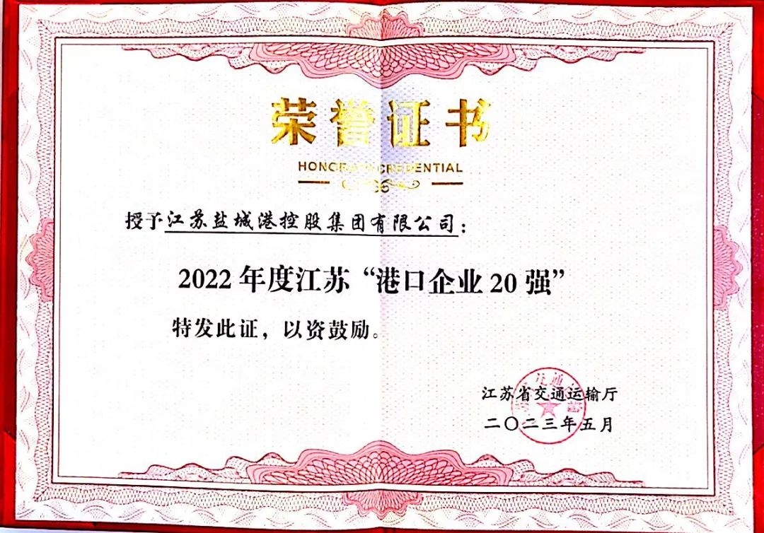 近日,省交通運輸廳首次舉辦江蘇交通“建設企業20強”等認定名單(附后)發布活動,鹽城港集團被認定為“2022年度江蘇港口企業20強”。
