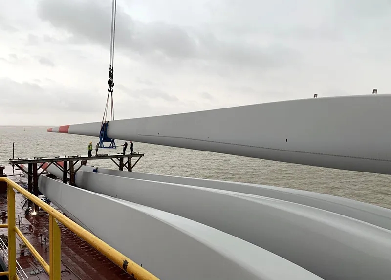 據(jù)悉,此次2套大型風(fēng)電葉片采用門座式起重機(jī)的作業(yè)方式裝卸,風(fēng)電葉片各長(zhǎng)71.4米,兩套總重達(dá)280噸,該批次風(fēng)電葉片將從濱海港區(qū)裝船啟運(yùn)至浙江岱山機(jī)位項(xiàng)目處。