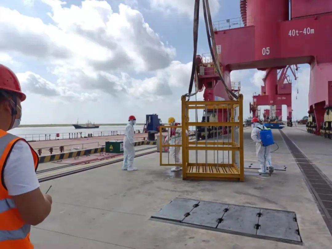本次演練模擬了港區靠泊船舶發現發熱船員的應急處置流程。演練中,港口調度員接到預警報告后,第一時間向指揮組報告情況,指揮組接到險情后立即向區防控辦上報,并啟動防疫應急預案,進行現場處置。現場救援組對碼頭現場進行封閉,用門機吊籃將發熱人員轉移至碼頭面,并使用港區疫情防控專用轉運車輛將發熱人員轉送射陽縣人民醫院發熱門診,同時對碼頭面及門機吊籃用75%的酒精原液進行消毒處理。