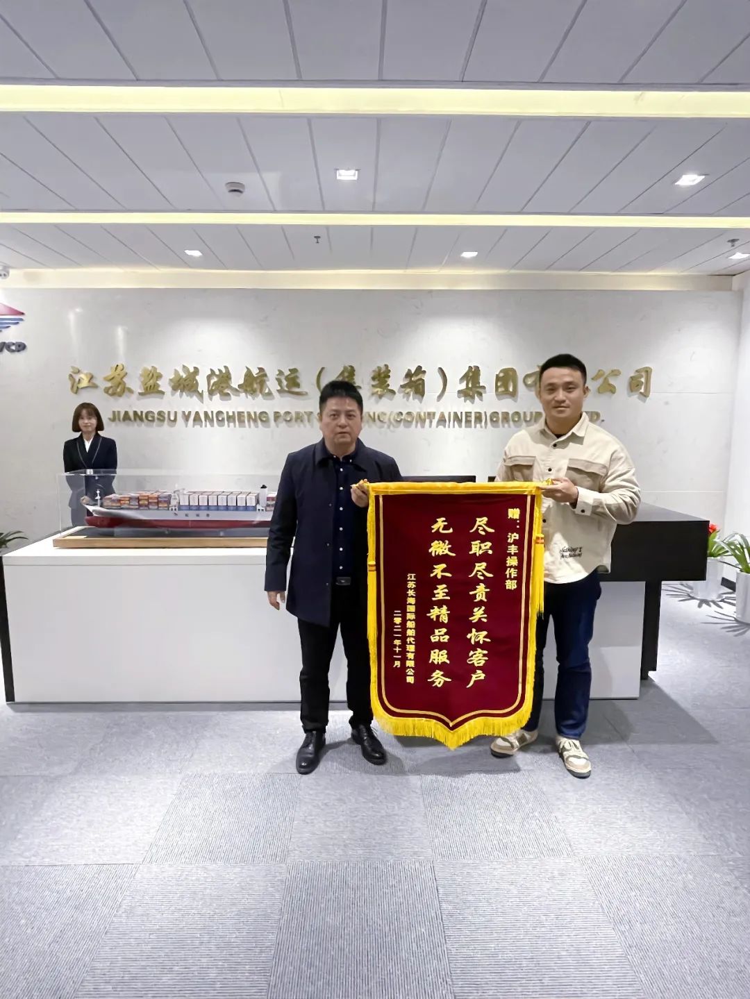 11月12日,江蘇長海國際船舶代理有限公司業(yè)務(wù)經(jīng)理吳長春一行拜訪江蘇滬豐集裝箱物流有限公司,將一面寫有“盡職盡責(zé)關(guān)懷客戶,無微不至精品服務(wù)”的錦旗送到滬豐公司,對滬豐公司操作部近年來提供的優(yōu)質(zhì)高效服務(wù)表示感謝。