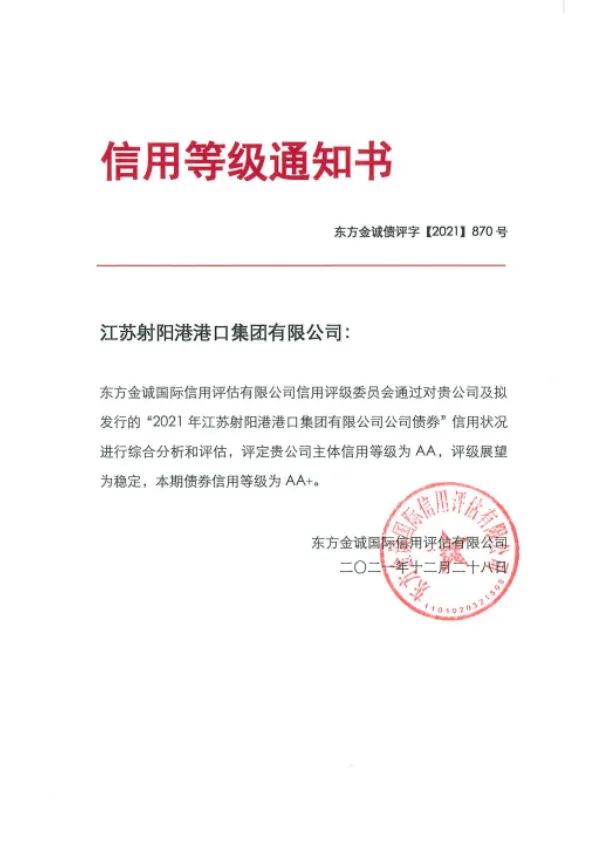 近日,經(jīng)過(guò)國(guó)內(nèi)權(quán)威信用評(píng)級(jí)機(jī)構(gòu)的綜合分析與評(píng)估,江蘇鹽城港射陽(yáng)港開發(fā)集團(tuán)有限公司榮獲AA級(jí)主體信用評(píng)級(jí),評(píng)級(jí)展望為穩(wěn)定,成為繼江蘇大豐海港控股集團(tuán)有限公司之后,鹽城港集團(tuán)合并范圍下屬內(nèi)第二家AA級(jí)主體信用評(píng)級(jí)子公司。