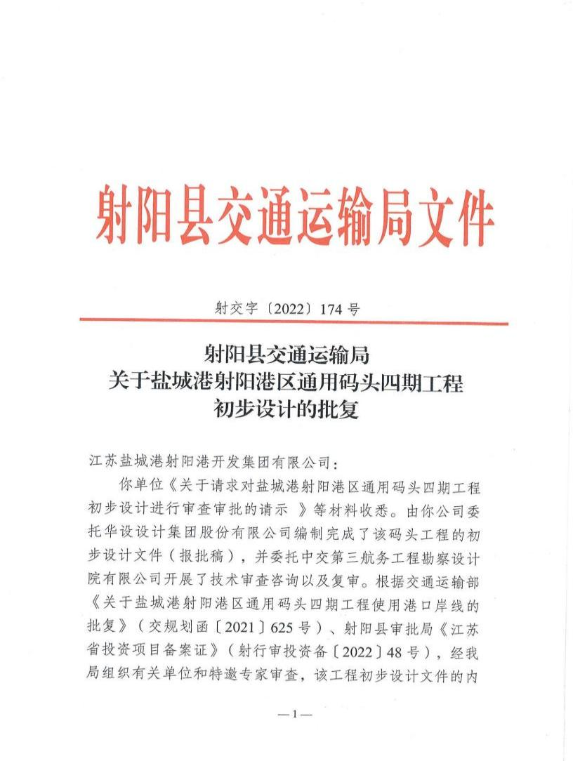 8月30日,鹽城港射陽港區(qū)通用碼頭四期工程項目初步設(shè)計和施工圖設(shè)計取得正式批復(fù)。至此,該項目已完成所有前期手續(xù),為項目的正式開工奠定了堅實的基礎(chǔ)。