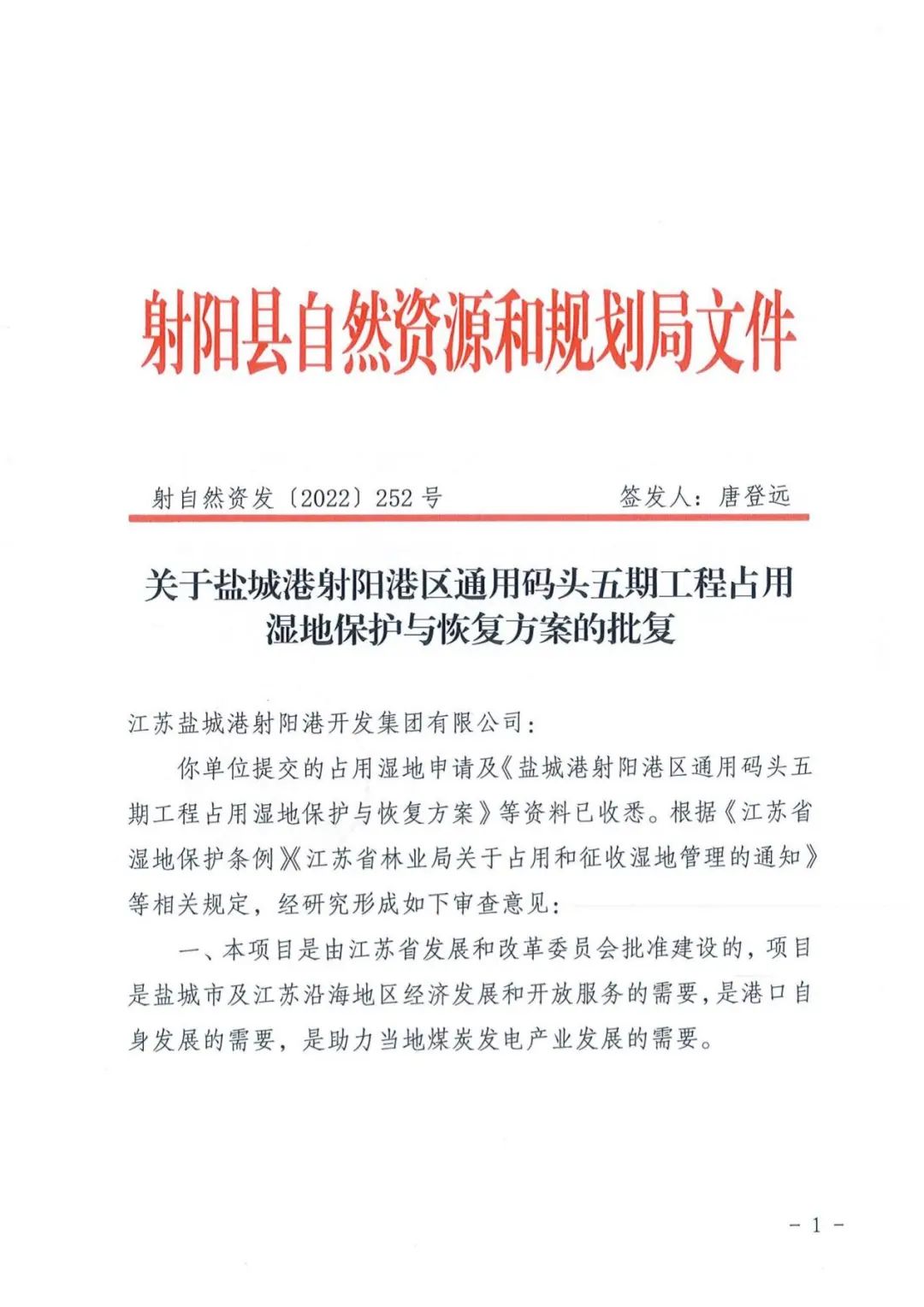 10月25日,鹽城港射陽港區(qū)通用碼頭五期工程占用濕地保護(hù)與恢復(fù)方案取得射陽縣自然資源和規(guī)劃局正式批復(fù),至此,該項目已完成包括備案、穩(wěn)評、岸線批復(fù)等多項前期手續(xù)辦理,為加快推進(jìn)該項目的正式開工奠定了堅實基礎(chǔ)。