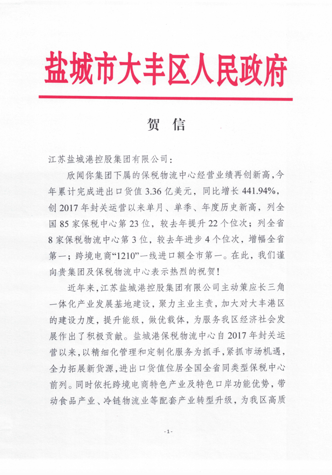 12月16日,大豐區(qū)人民政府向我集團(tuán)發(fā)來賀信,對我集團(tuán)下屬保稅物流中心經(jīng)營業(yè)績再創(chuàng)新高表示祝賀。