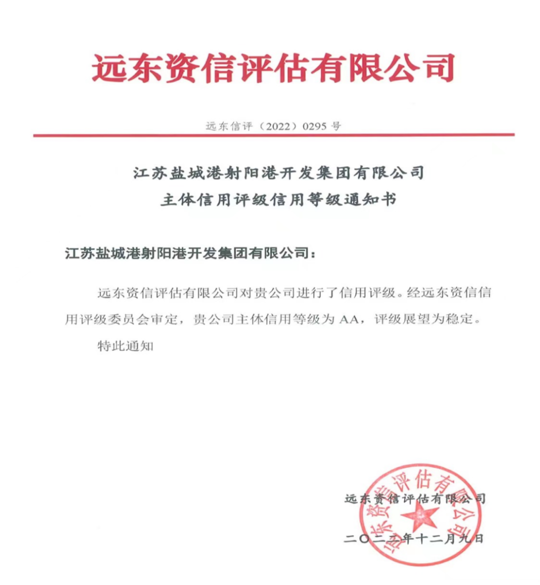 近期,經(jīng)遠(yuǎn)東資信信用評級委員會審定,江蘇鹽城港射陽港開發(fā)集團(tuán)有限公司成功獲得AA級主體信用評級,評級展望為穩(wěn)定。