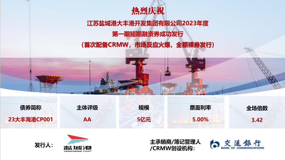 4月28日,大豐港開發(fā)集團2023年度第一期短期融資券成功發(fā)行,發(fā)行規(guī)模5億元,發(fā)行利率5%,全場認購3.42倍,創(chuàng)大豐港開發(fā)集團近幾年來債券融資成本最低。本期債券,創(chuàng)新通過交通銀行風(fēng)險緩釋憑證吸引了投資熱度。債券的成功發(fā)行充分反映了投資機構(gòu)對鹽城港集團發(fā)展的高度認可,進一步提振了資本市場對鹽城港航事業(yè)發(fā)展的信心。