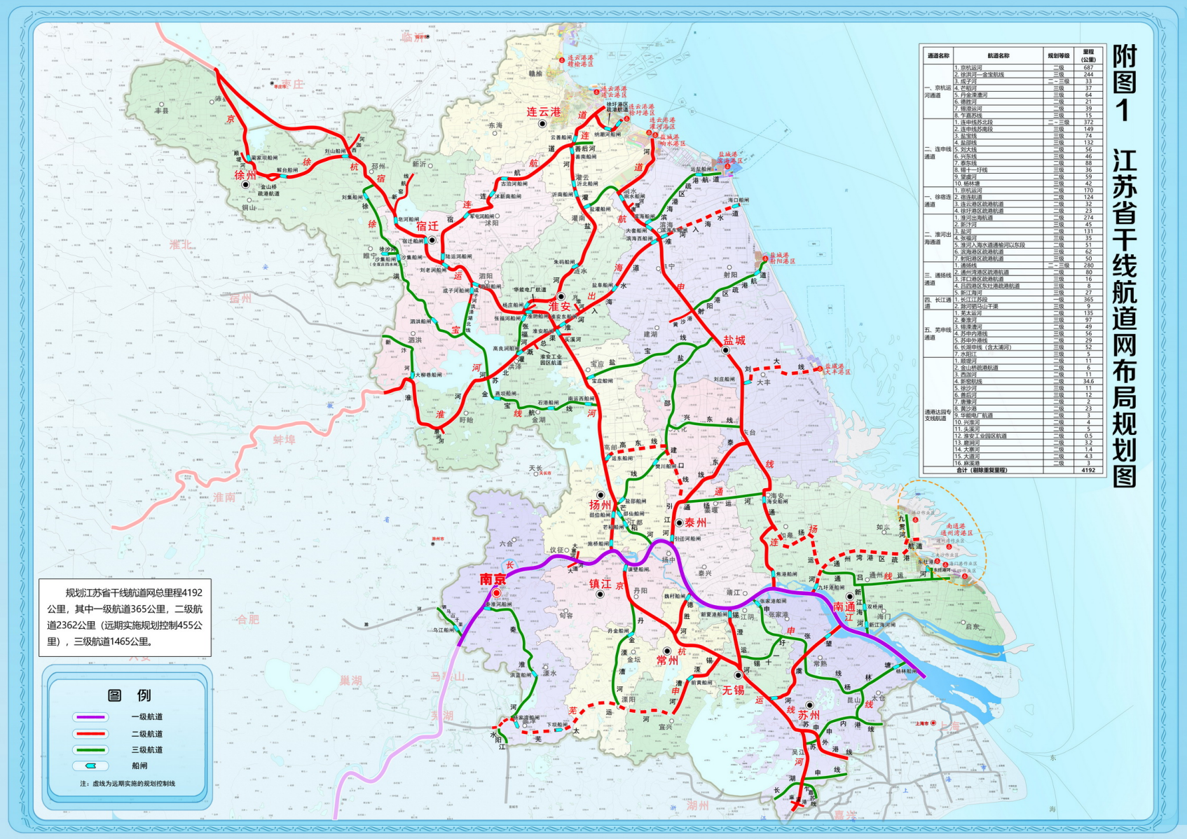 《規(guī)劃》明確,至2035年,全省干線航道網(wǎng)規(guī)劃總里程4192公里,總體呈現(xiàn)“兩縱五橫”的布局形態(tài),形成以長江干線、京杭運河、淮河國家水運主通道為核心,二級及以上航道為主體、三級航道為支撐的“聯(lián)網(wǎng)暢通、達(dá)海通江、優(yōu)質(zhì)高效、保障有力”的干線航道網(wǎng)絡(luò)。
