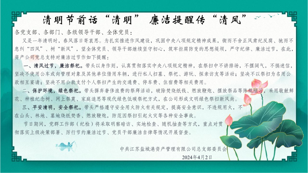 為進一步深化全面從嚴治黨和黨風廉政建設(shè)工作,深入推進廉政教育,教育引導全體干部職工嚴守紀律紅線、筑牢廉潔底線,資產(chǎn)公司黨總支堅持“教育在先、警示在先、預防在先”原則,多措并舉、系統(tǒng)施策,打出“教育促廉、承諾悟廉、安全踐廉”等組合拳,堅定不移糾治“四風”,推動節(jié)日風氣持續(xù)向好。