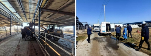 棚舍內,裝載機往來穿梭,轟鳴聲不斷。工作人員加班加點清理牛糞并運往糞污處理區,對牛棚進行全面清掃。身著防護服的消毒人員,手持專業消殺設備,對場地、棚舍、通道以及各類設備進行全方位消毒,為種牛營造一個安全、衛生的環境。