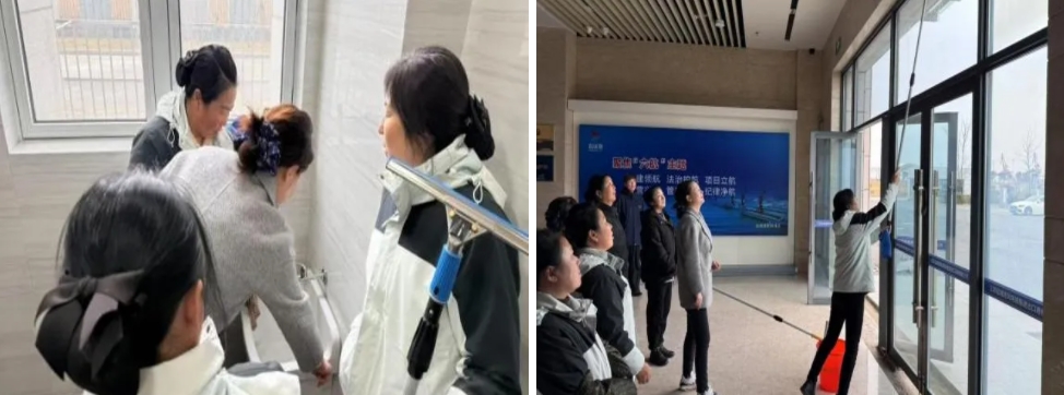 培訓現場圍繞重點區域清潔、保潔工具使用技巧、保潔頻次和保潔規范等方面,采用現場教、實地訓的方式,詳盡重點,確保每位保潔員都能將作業技巧、標準要求了然于心。實操中,保潔組全員化身“清潔奇兵”,各司其職,嚴格按規范操作,以日常保潔、深度清潔、機制清潔的高標準,為港區營造了干凈、整潔的工作環境。