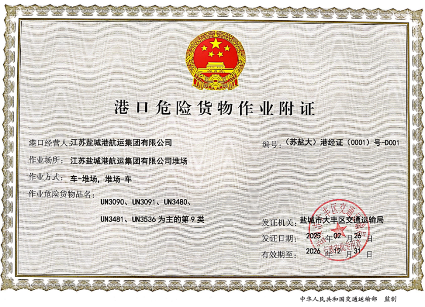 今年以來,為推動港口危險貨物集裝箱業務開展,在交通、海關、海事、邊檢、安監、環保等部門的大力支持和指導下,航運集團集裝箱堆場分公司科學規劃堆場布局、優化運輸路線、配置智能化設施、提升業務人員資質、完善應急預案,成功取得“港口經營許可證”“港口危險貨物作業附證”雙證,成為鹽城地區首家且唯一的集裝箱危險貨物堆場,為全市“新三樣”產業提供了一條最為便捷的運輸通道。