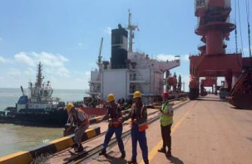 正午驕陽炙烤,地面溫度節節攀升。調度員的工作服早已被汗水浸透,緊貼脊背,但他們沒有絲毫懈怠,不停穿梭于碼頭前沿,實時調配生產資源。“臺風預警,今晚22點前必須卸空離泊避風!”調度員抹去額角的汗珠,目光如釘般鎖定作業進度,確??崾钪卵b卸效率不降分毫。